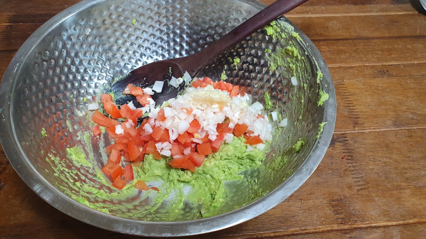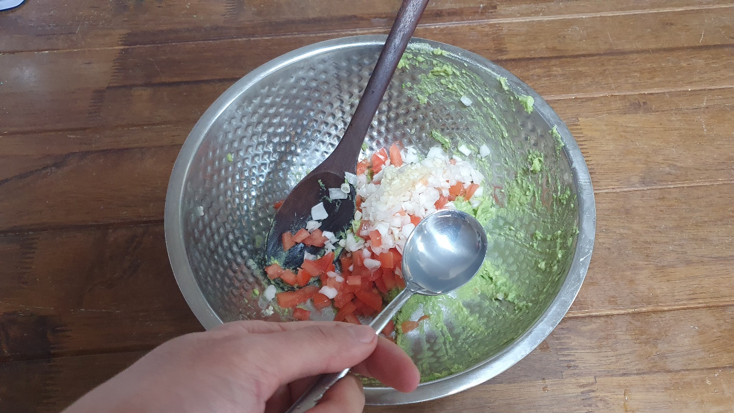 아까 만들어둔 아보카도에 토마토, 양파, 마늘 전부 넣어주세요.