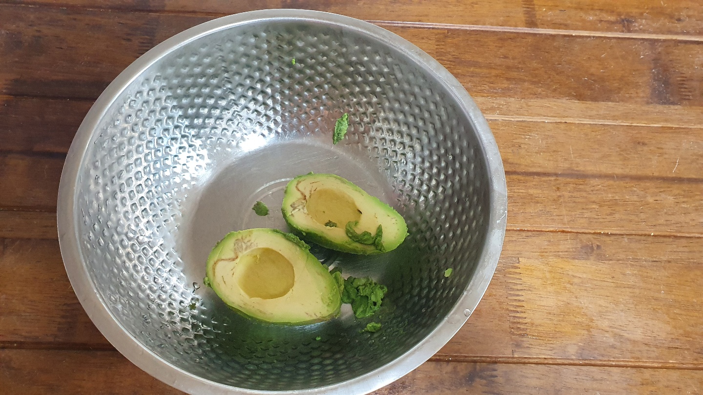 아보카도 껍질을 까서 으깰 수 있는 바가지나 그릇에 담습니다.